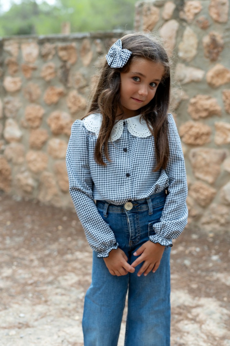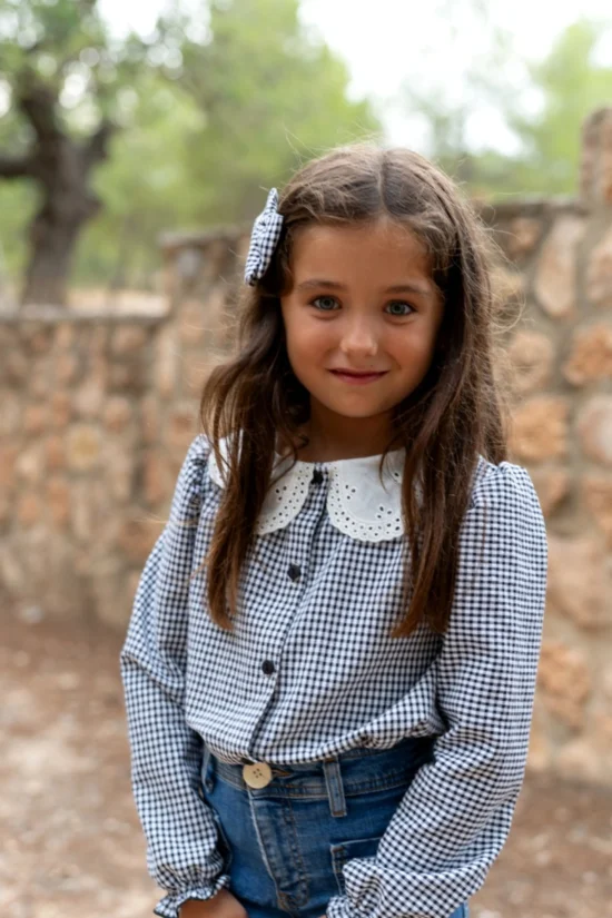 La Blusa Nogal de niña es ideal tanto para looks diarios como para celebraciones familiares. Su estampado en vichy negro y blanco la convierte en una pieza que combina fácilmente con faldas, pantalones o complementos, logrando conjuntos llenos de encanto y personalidad.