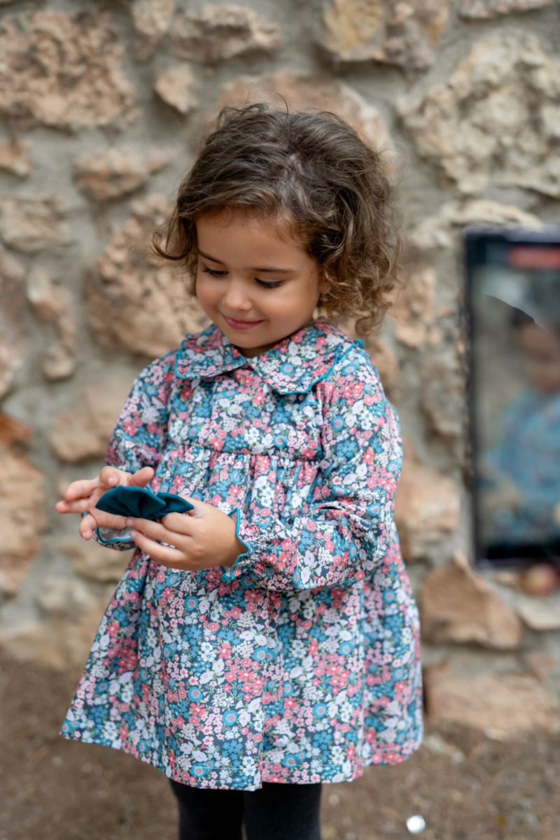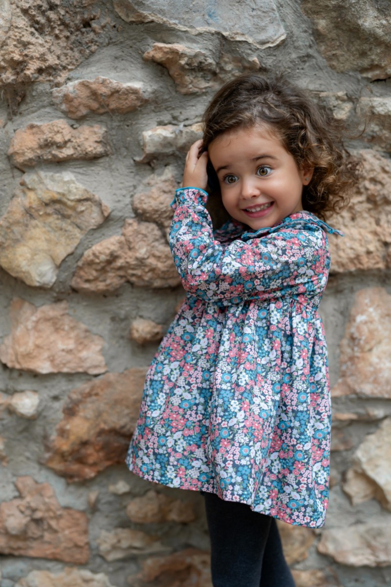 Su cuello camisero, las mangas largas y el fruncido bajo el pecho aportan un aire elegante sin perder frescura. Además, su patrón amplio permite a las niñas moverse con total libertad, ideal para jugar, correr o disfrutar de cualquier actividad.