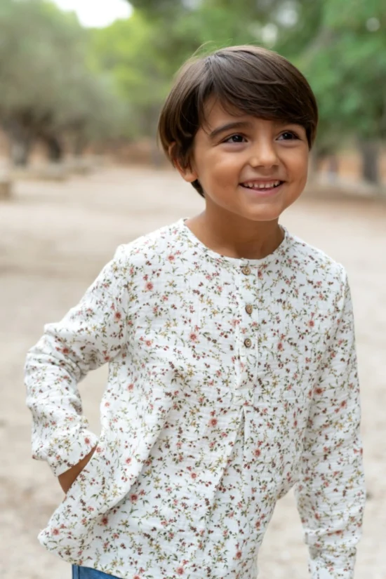Su cuello redondo con botones de madera aporta un aire natural y dulce. Asimismo, las mangas largas y el corte holgado permiten que los niños se muevan con total libertad. El fruncido sutil bajo el pecho añade un toque de estilo sin perder funcionalidad.