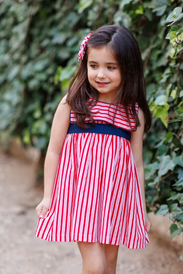 -Vestido niña rayas rojas con cuello marinero