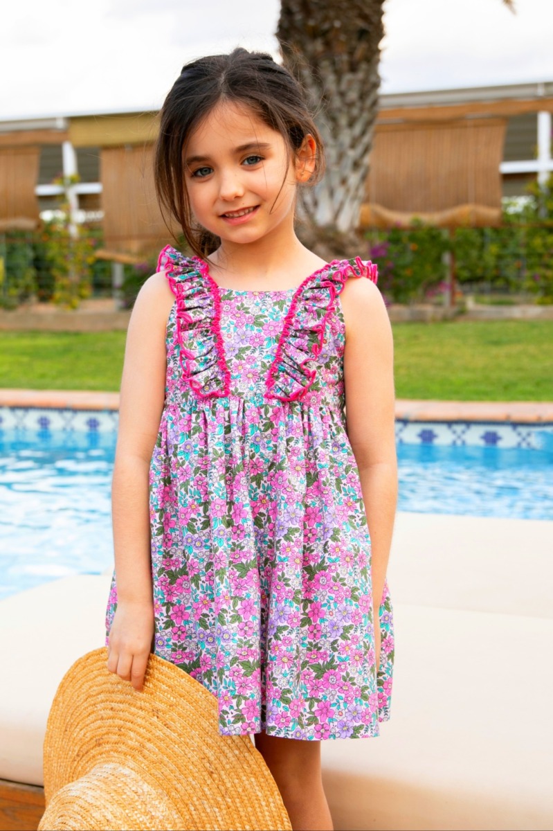 Este vestido de moda infantil está hecho con algodón 100% natural, lo que lo hace muy suave al tacto. Incluye volantes en las mangas, un estampado exclusivo y botones de madera en la espalda. Así que no solo es bonito: también es práctico para el día a día.