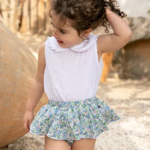 • ¡Oferta! Blusa blanca infantil combinada con falda floral azul de vuelo, moda encantadora de Sutier.